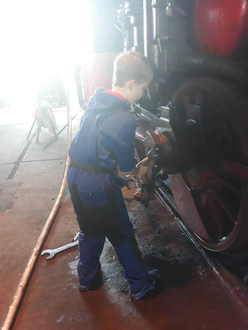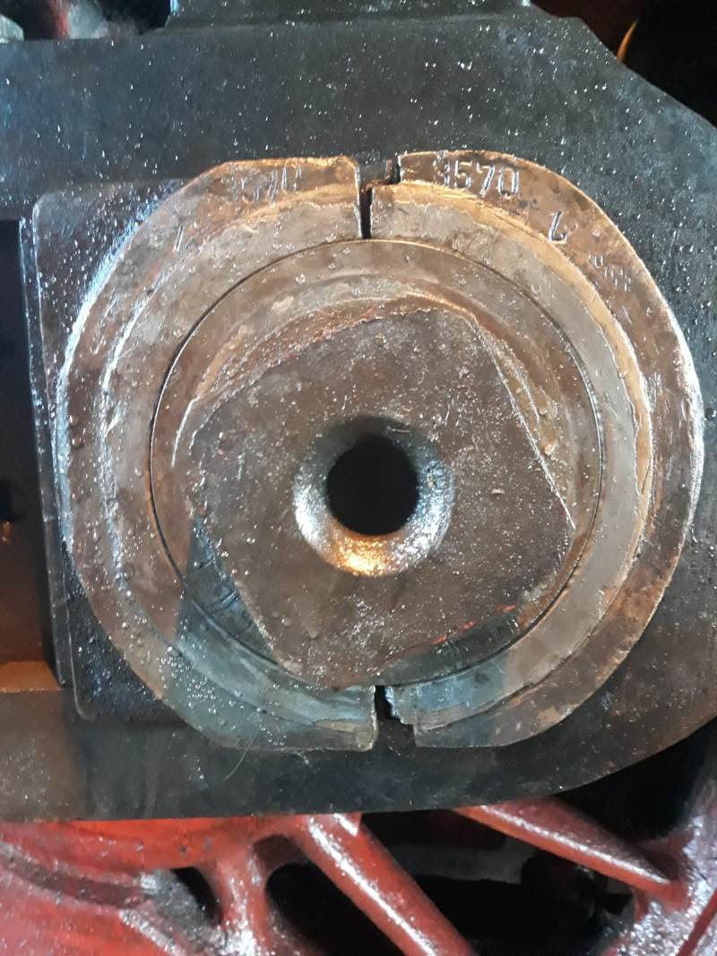 Zwar stehen leider unmittelbar keine Einsätze für 50 3570 an. Allerdings haben wir in der Winterpause das linke Treibstangenlager der Lok bearbeitet und am 16.05.2020 wieder eingebaut. Dabei handelt es um das Lager, welches den Antriebszapfen am Treibrad der Lok umfasst und in der mächtigen Treibstange sitzt, welche die Kolbenstange aus dem Dampfzylinder mit dem Antriebsrad auf der linken Seite der Lok verbindet. Dabei handelt es sich um ein sogenanntes Gleitlager. Darin gleiten die Lagerschalen auf einem sehr dünnen Ölfilm auf dem sich darin drehenden Zapfen. Da die Antriebsenergie der Lok hier auf das Rad übertragen wird, muss das Lager sehr genau gearbeitet und die Ölschmierung ausreichend sein, damit der Ölfilm nicht abreißt und es einen Lagerschaden gibt.