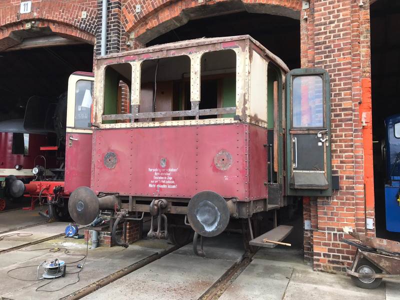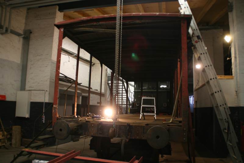 Auf dem nächsten Bild erkennt man den Wagen am 16.11.2019. Hier sind die hölzernen Seitenwände schon vollständig entfernt. Auch die Stirnwandstreben wurden zur Aufarbeitung ausgebaut.