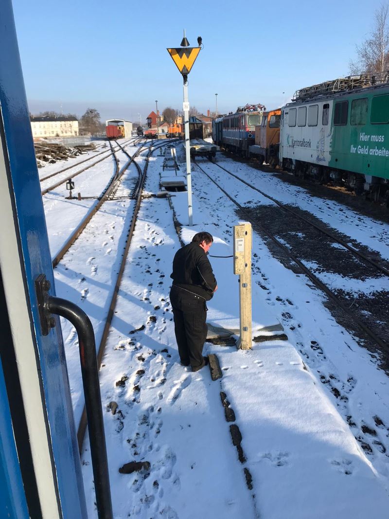 Dieser Rangierbezirk bekommt demnächst weitere technische Ausrüstung: Das neue Rangiersignal ist nun technisch instandgesetzt und wartet auf den Einsatz. Wir stellen das Bild hier bewusst um 90 Grad gedreht dar, weil das Signal so wie gezeigt aufgestellt werden soll. Wir warten nun auf das Ende des Frostes, damit ein Fundament dafür hergestellt und das Anschlusskabel vom Stellwerk bis zu seinem Standort gelegt bzw. angeschlossen werden kann.