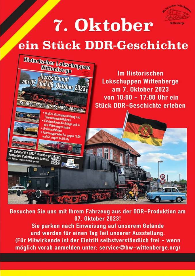Wenn Sie am Samstag, den 7. Oktober, mit dem Auto anreisen und es aus DDR-Produktion stammt, haben Sie die Gelegenheit, damit direkt auf das Museumsgelände zu fahren und sich den Eintrittspreis zu sparen. Wir bitten allerdings um Voranmeldung per Email an