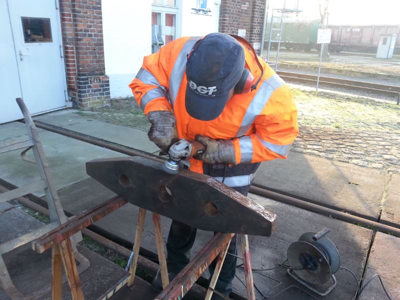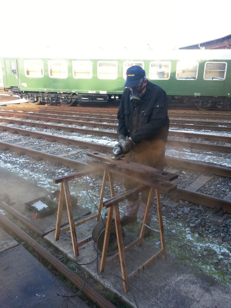 Auch die Arbeiten an der Diesellok 60022 gingen weiter. Hier nutzen andere Aktive das schöne Wetter, um staubige Arbeiten vor dem Lokschuppen zu erledigen. Hier werden gerade Teile der Bremsanlage von Staub und Rost befreit, um nachher mit Rostschutzfarbe lackiert werden zu können.