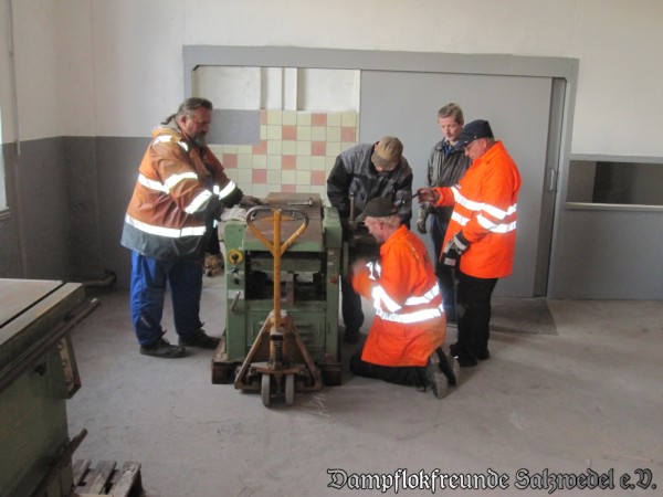 Am Samstag, den 6.10. startete die heiße Phase des Umzuges von Salzwedel nach Wittenberge. Schwerpunkt war erstens der Umzug unserer Werkzeugmaschinen (Drehbank, Presse, Bohrwerke, Holzbearbeitungsmaschinen usw.) Dabei handelte es sich jeweils um "dicke Brocken" mit Gewichten zwischen 300 Kilogramm bis fast 4 Tonnen Gewicht. Wir waren sehr froh über die Unterstützung von Profis, die mit ihrem schweren Gerät die Anlagen scheinbar mühelos bewegen und in Wittenberge aufbauten.