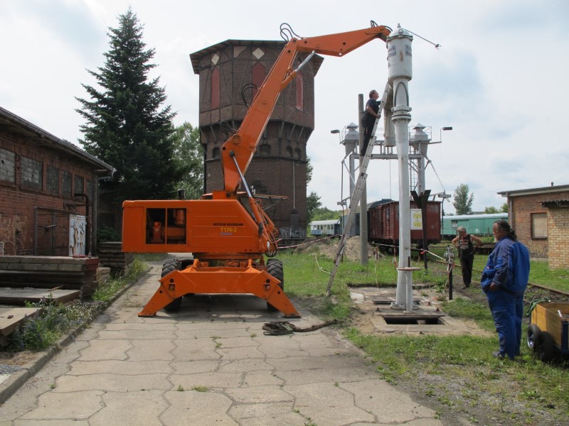 Zum ersten Mal seit 25 Jahren floss Wasser vom Wasserturm in einen wieder errichteten Wasserkran zum Betanken von Dampflokomotiven. Den Wasserkran haben wir vom Ausbesserungswerk Wittenberge der Deutschen Bahn AG zur Verfügung gestellt bekommen. In monatelangen Vorarbeiten hatten die Vereinsmitglieder an historischer Stelle ein dafür vorgesehenes Fundament freigelegt und instand gesetzt, Rohrleitungen geprüft und repariert und den Kran selbst errichtet. Auch der Wasserturm selbst, der ein Fassungsvermögen von rund 150m³ besitzt, wurde technisch überarbeitet und erhielt neue Pumpen zum Befüllen der Anlage. Der Wasserkran wird uns Befüllen unserer Dampfloks gute Dienste leisten und ist eine Attraktion für unsere Besucher. Ein weiterer Wasserkran wird demnächst vor der Lokleitung aufgestellt.