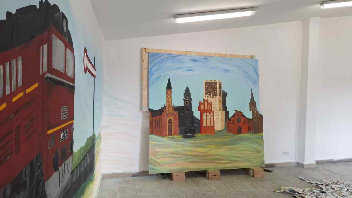Doch auch nach der Veranstaltung geht es im Museum weiter: Ganz besonderes Vergnügen bereitet uns eine Schülergruppe des Marie-Curie-Gymnasiums, die im Rahmen eines Kunstprojektes einige Wände in unserem zukünftigen Ausstellungsraum gestaltet. Dabei werden Eisenbahnmotive aus Wittenberge nach Fotovorlage auf die Wände gemalt. Wir sind begeistert und sagen Danke, dass die Motive so toll geworden sind.