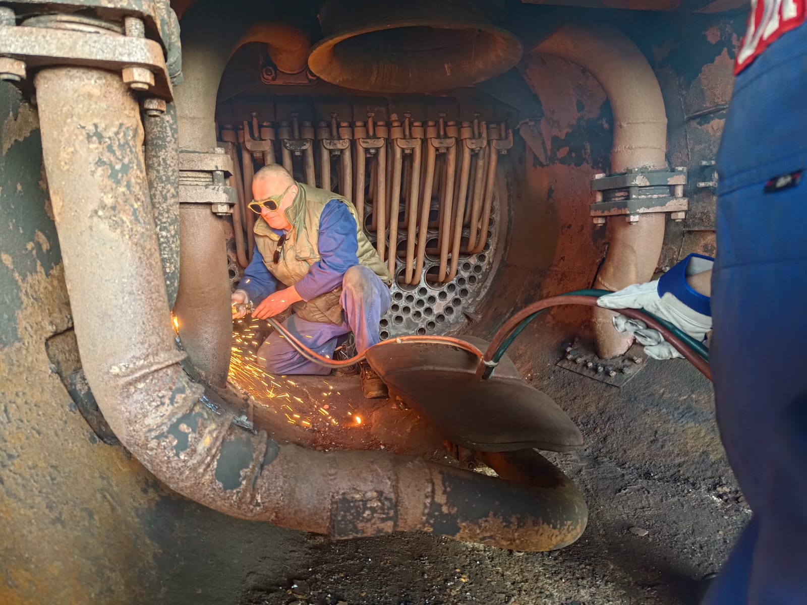 So gehen die Arbeiten am Kessel unserer Dampflok 50 3570 weiter. Mit dem „heißen Schraubenschlüssel“ oder auch Schneidbrenner haben wir die Rauchkammer des Kessels vollständig von Rohrleitungen befreit, damit demnächst die neuen Heizrohre in den Kessel eingebaut werden können.