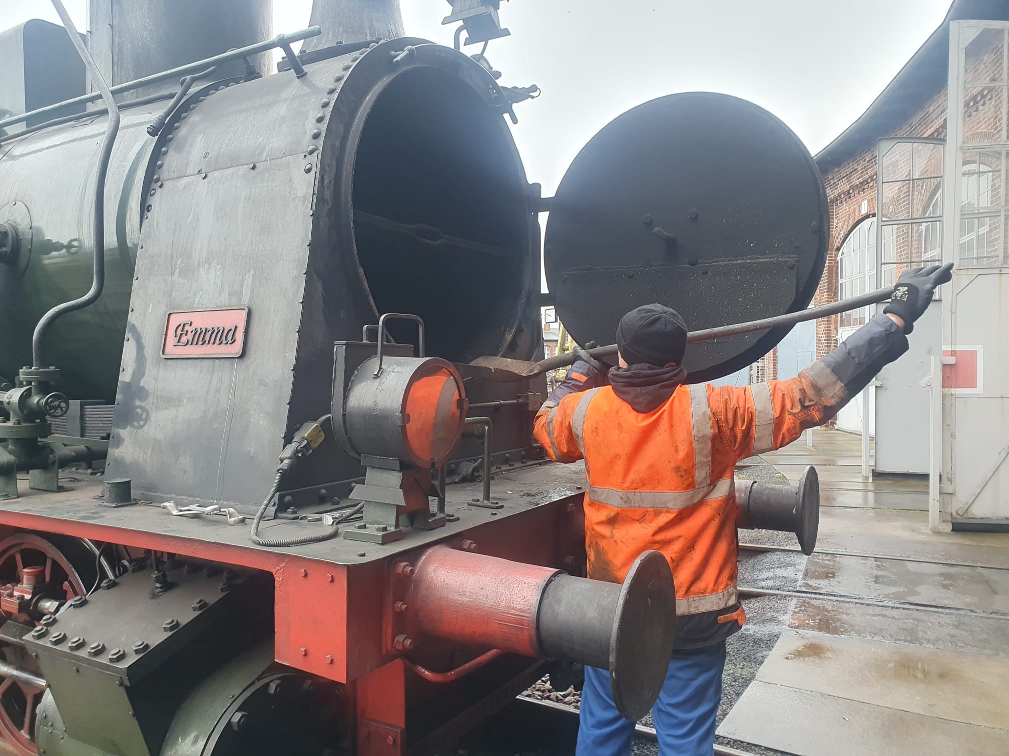 Wir haben uns auch weiter um unsere kleine Dampflok Emma gekümmert. Hier mussten die Wassertanks im Rahmen der Lokomotive gereinigt werden, damit Kalk und Schmutz nicht irgendwann von den Speisepumpen der Lok angesaugt werden und diese verstopfen. Das ist eine ziemlich anstrengende und schmutzige Angelegenheit, weil man die entsprechenden Luken unter der Lok öffnen und dann den Schmutz aus den Tanks herauskratzen muss.
