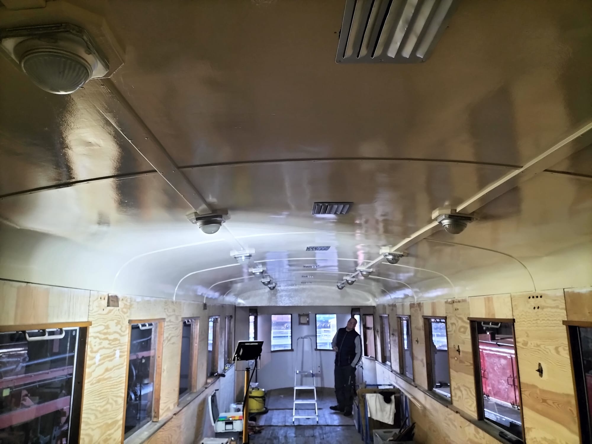 Außerdem gingen die Arbeiten an unserem Wagen 197 805 weiter. Nachdem nun alle Deckenplatten und Deckenleisten eingebaut sind, konnte die Decke mit Farbe versehen werden. Wir hoffen, dass wir bald einen neuen Linoleum-Belag auf den Fußboden verlegen können.