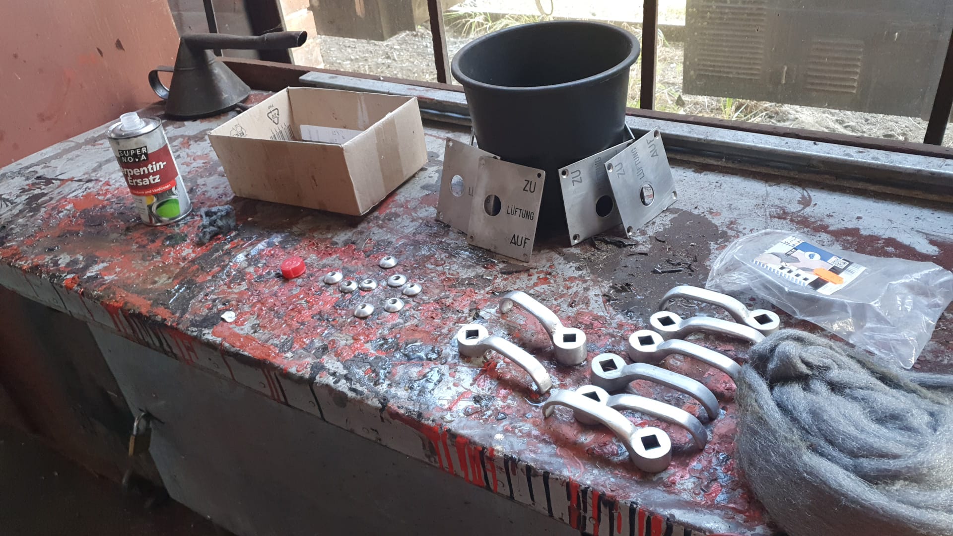 Auch am äußeren Erscheinungsbild des Tenders wird gearbeitet. Hier wurde der noch vorhandene Lack soweit angeschliffen bzw. ganz entfernt, damit demnächst eine Grundierung aufgebracht werden kann. Wir hoffen, dass sich die Außentemperaturen noch ein wenig länger im zweistelligen Bereich bewegen, so dass wir vor der Winterkälte auch noch die schwarze Endlackierung aufbringen können.